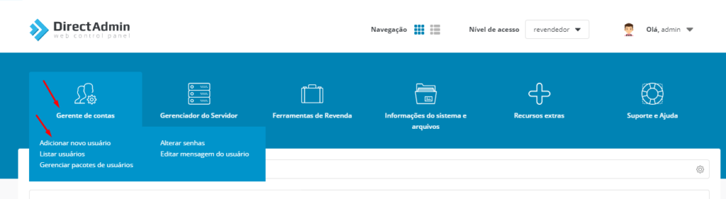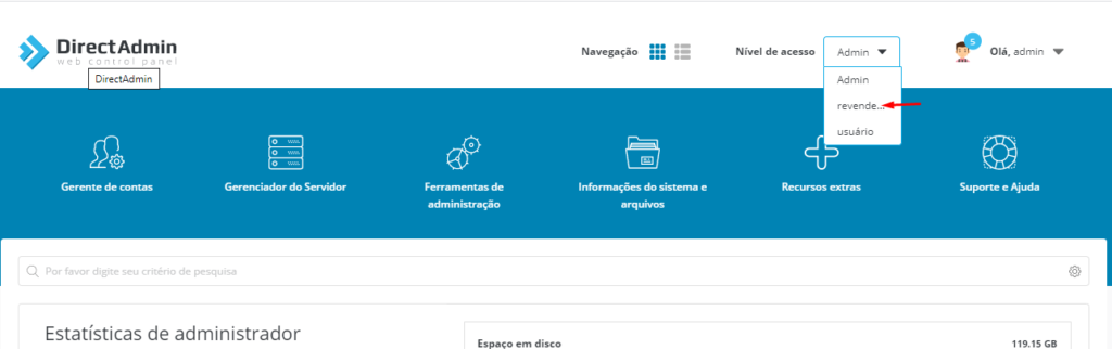 Agora que você logou no painel do Directadmin, altere seu nível de ‘Acesso’ – faça isso usando o menu suspenso na parte superior e alterando-o de “Admin” para “Revendedor”.