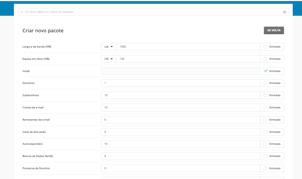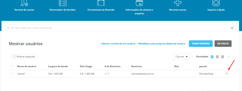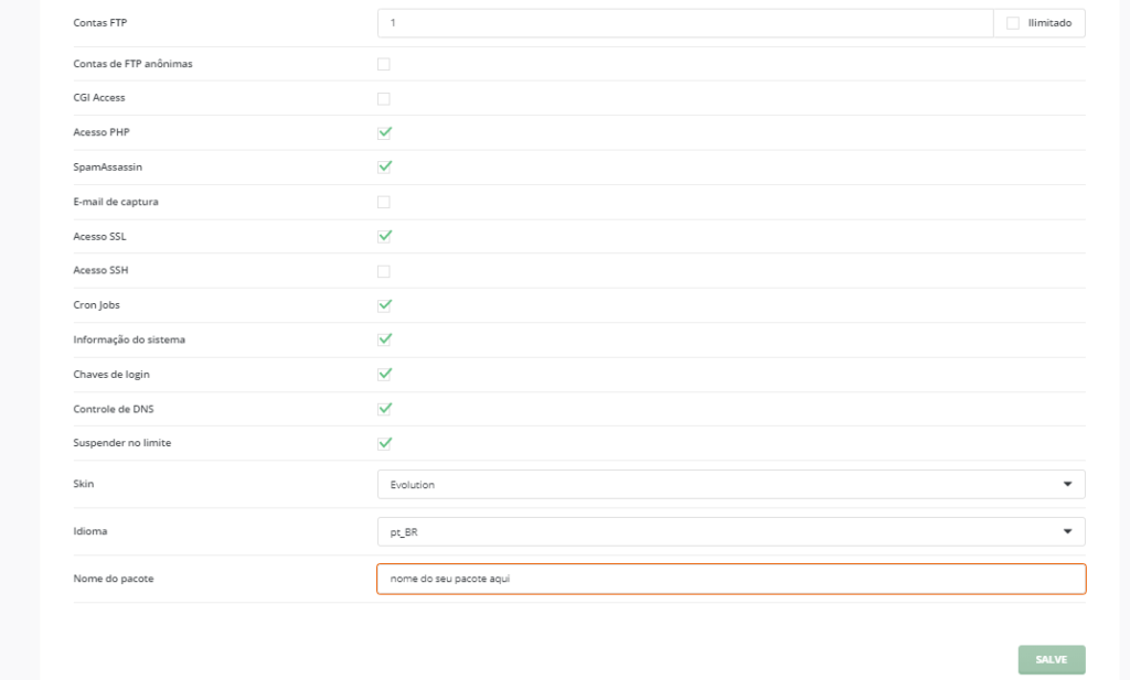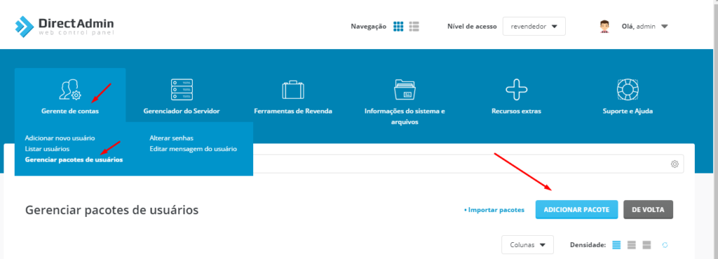 Vamos em Gerente de conta > Gerenciar pacotes de usuários > Adicionar Pacote (É aqui que vamos criar os planos da sua Revenda de Hospedagem)