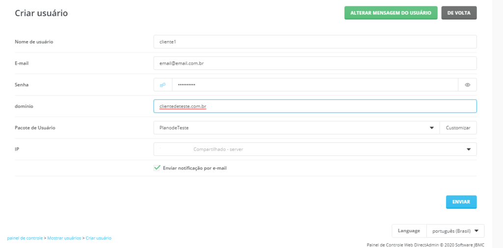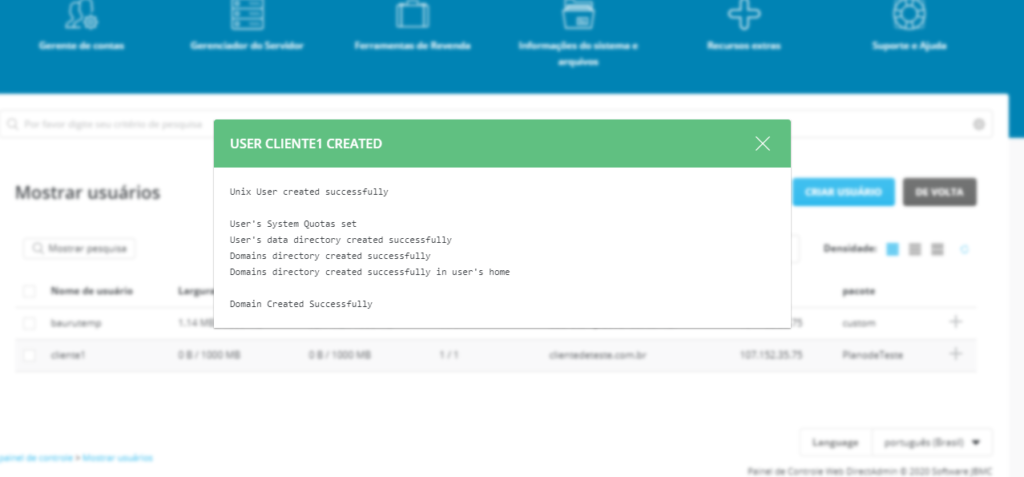 Parabéns você concluiu sua criação de conta e plano de hospedagem no Directadmin