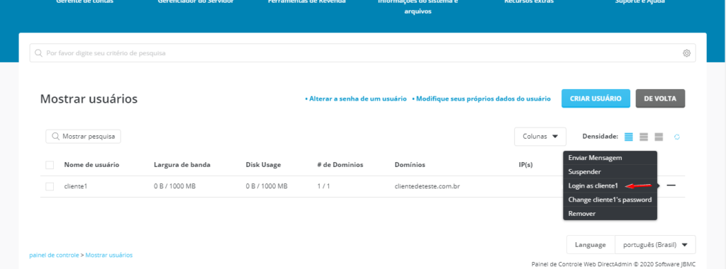 Agora clique em Login as e o nome de usuário você colocou na sua conta (Aqui no caso foi Cliente1) e pronto já vai está logado na sua nova conta